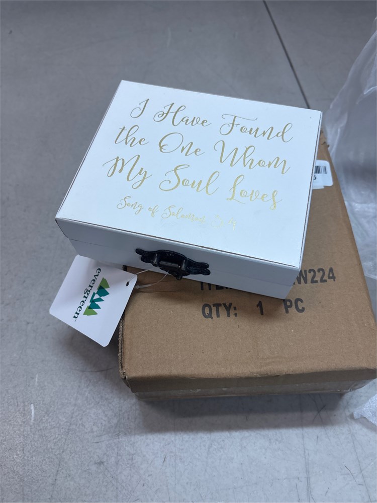 Keep wedding rings safe and secure in this adorable wooden ring holder box! This white wooden ring box is both functional and perfect to incorporate into your wedding photos and kept after as a keepsake. The inscription reads "I Have Found The One Whom My Soul Loves - Song of Solomon 3:4." Secure this decorative, elegant box with a buckle clasp. Makes a thoughtful and charming wedding gift ideal for engagement parties, bridal showers, weddings, bachelorette/bachelor celebrations, anniversaries, and Valentine's Day! This Mr. And Mrs. Ring holder measures approximately 5"W x 6"D x 2"H. The perfect alternative to a ring bearer pillow! Highlights: Measures 6"W x 2"H x 5"D.