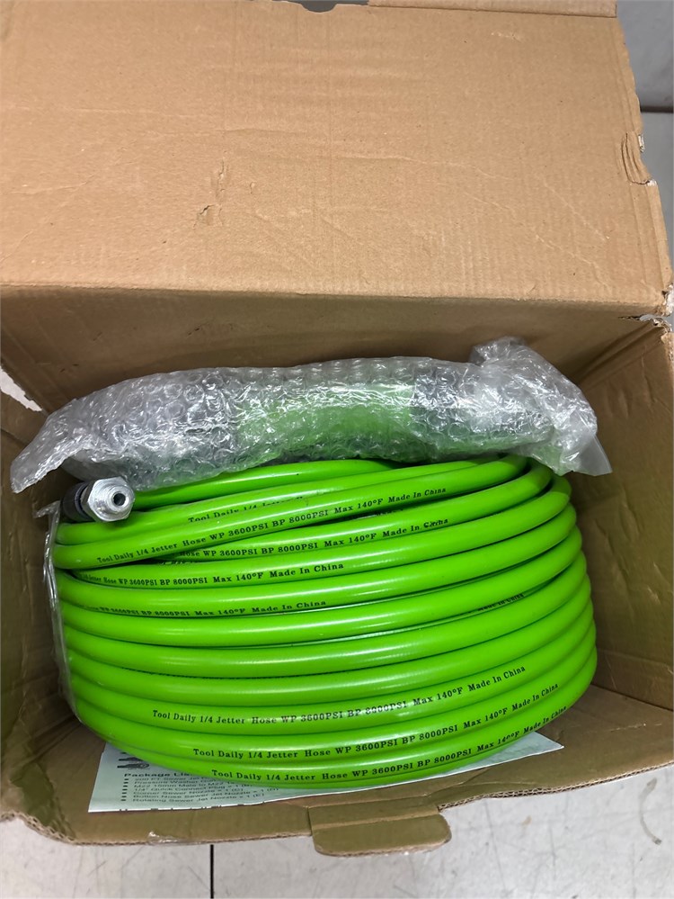 SEWER JET KIT LIST: 1 x 200ft sewer jet hose, 1 x pressure washer short gun, 1 x button nose sewer nozzle, 1 x rotating sewer jetting nozzle, 1 x corner sewer jetter nozzle, 1 x 1/4 NPT female to 1/4 quick connect plug adapter, 1 x M22-14mm female to M22-15mm male connector, 1 x Teflon tape, 2 x spanners, and a box of fine needles UPGRADED JETTER HOSE: The sewer jetting hose has a 0.44in outer diameter. It's flexible yet tough, with a fixed and a swivel fitting. This design lets the hose and nozzles pass through the sewer line easily and prevents kinking. Made with a PE tube, PVC cover, high-intensitive terylene reinforcement, reinforced protective sleeves, and heavy-duty ends, it's extremely sturdy and durable. It can resist weather, oil, ozone, and abrasion. Max pressure: 3600PSI.