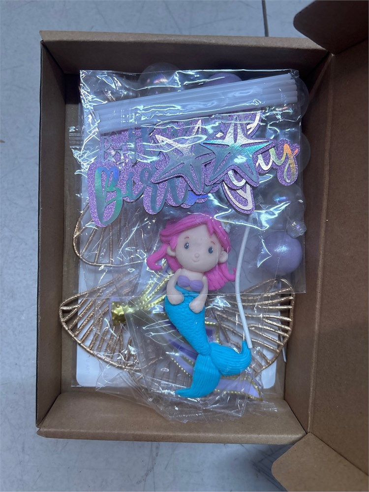 Package Includes 1 mermaid ornament, 1 set of coral cake toppers 3pcs , 1 set of happy birthday cake toppers(5pcs), 1 fishtail, 1 artificial ginkgo leaf, 5 white balls, 3 purple balls. Size as the picture shows. Safe Material The mermaid is made of soft clay. Happy birthday cake toppers are made of glitter paper. Fishtail, coral and white balls are made of plastic. Purple balls are made of foam.