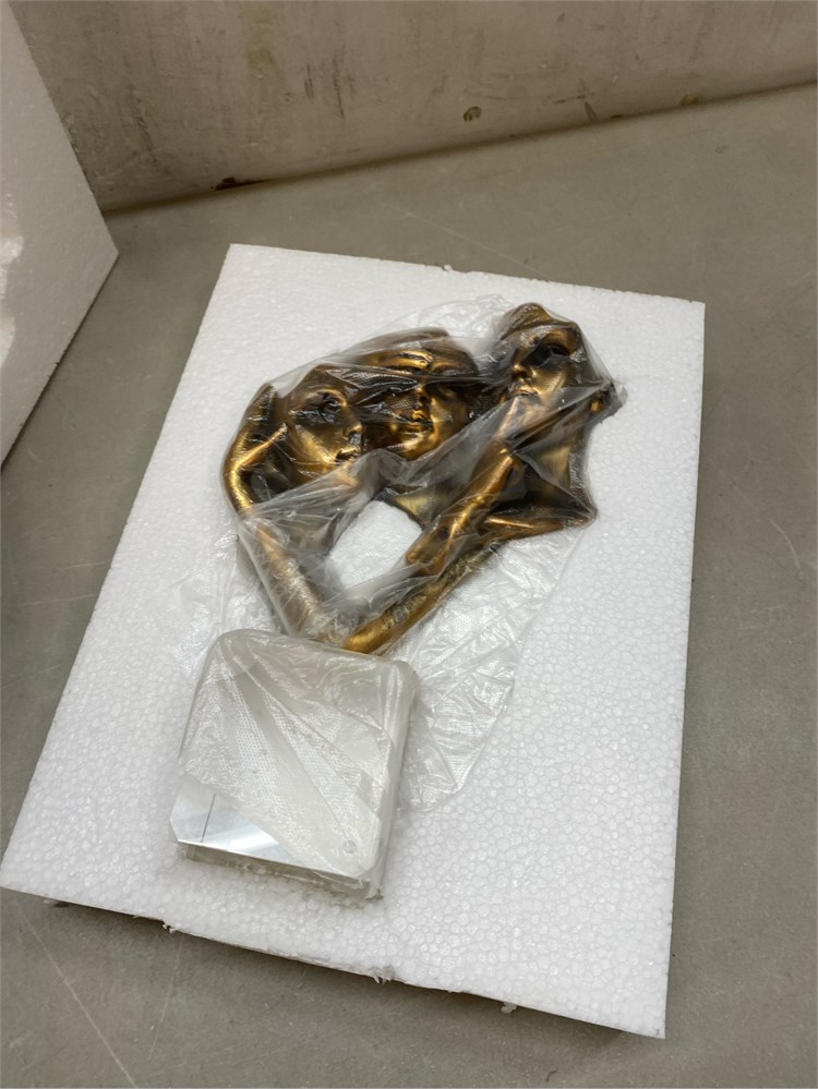 Artistic Sculpture: This captivating sculpture depicts three expressive human faces intertwined in an abstract yet harmonious composition. Premium Material: Made of high quality resin with an exquisite gold patina finish, showcasing the artist's meticulous attention to detail. Thought-Provoking Design: The intriguing facial expressions and unique arrangement provoke contemplation and spark conversation. Versatile Decor Piece: Suitable for display in homes, offices, galleries, or as a distinctive centerpiece in any modern interior setting. Dimensions: Measures approximately 12 inches in height and 8 inches in width, with a sturdy acrylic base for stability.